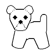 Either side of the dog can be used for the outside. Sew both sides of the face, as indicated in the diagram, leaving an opening for the stuffing on the underside of the dog's neck. When sewing the leg seams, notice that the final row of crocheting is not good to use, because there are spaces that the stuffing could get through, sew use the second to the last row instead of that row. Sew the foot and side seam of each of the front legs. Sew the foot and side seam of the back legs, gathering, as indicated in the diagram. Sew the tummy to the legs and sides of the dog. The 4-stitch part is between the legs, the 6 stitch part is the tummy.